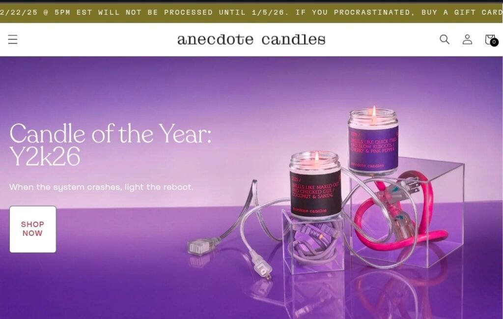 Anecdote Candles connects with younger audiences through playful scent names, nostalgic themes, and minimalist packaging. Despite the humour-forward branding, the candles are well-crafted and thoughtfully scented.