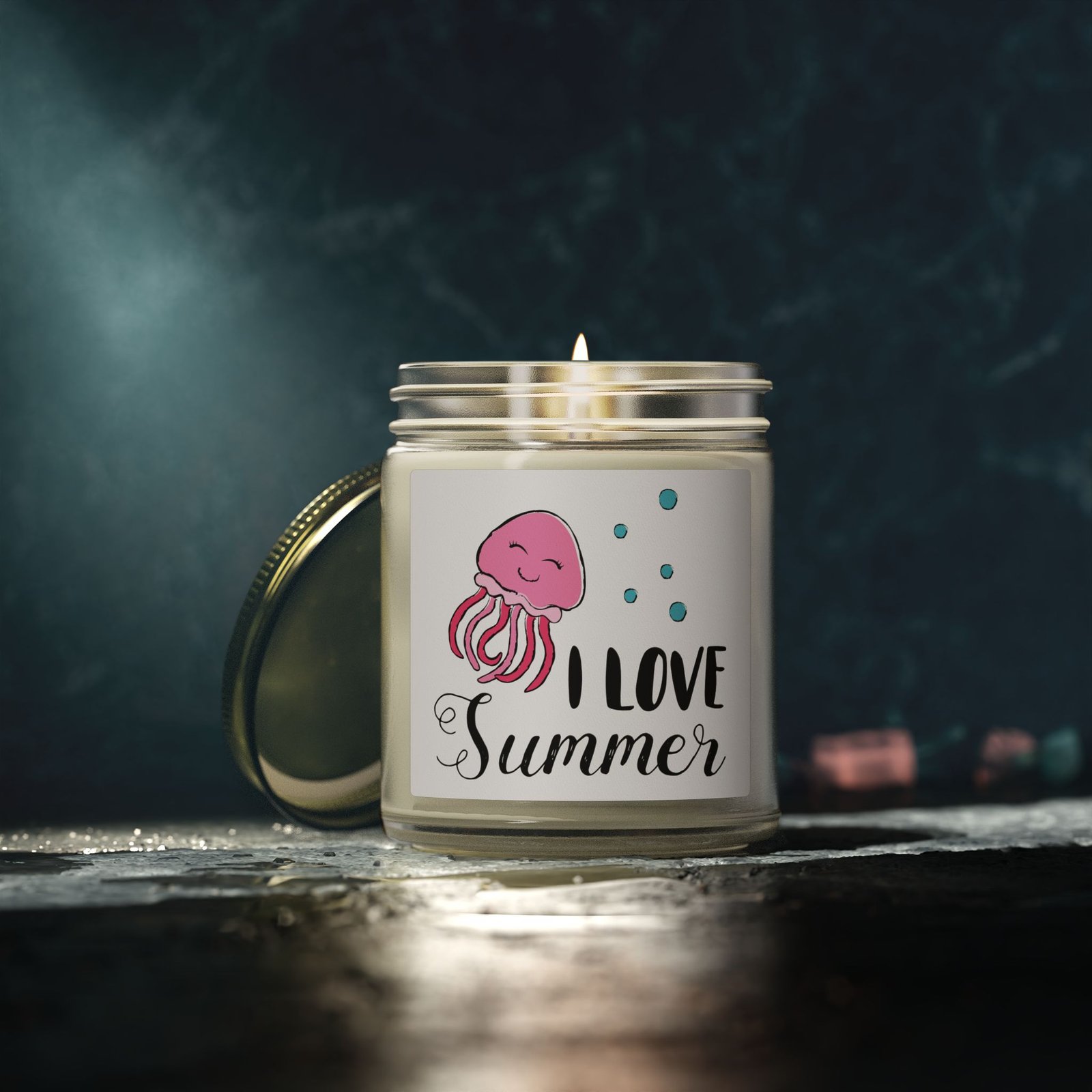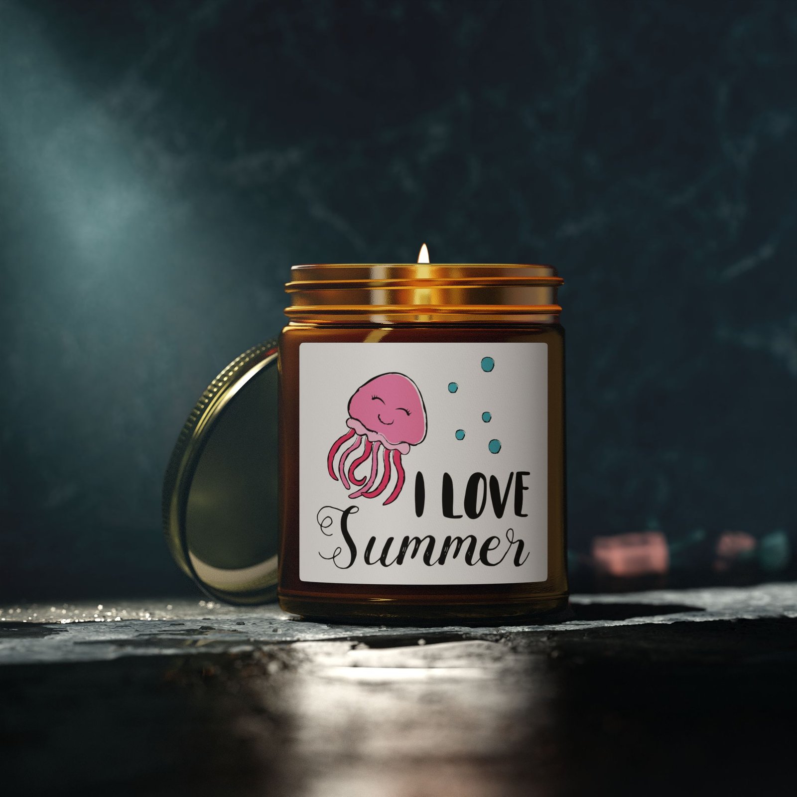 Bring a splash of joy to your space with our “I Love Summer” Scented Candle. Featuring a whimsical hand-drawn pink jellyfish and playful typography, this candle is a tribute to carefree days and warm ocean tides. Housed in a rich amber glass jar with a gold lid, it creates a cozy, golden glow that perfectly complements the “summer vibes” aesthetic.
